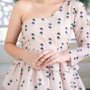 Trendia brings you this Women’s One shoulder Ruffle Dress by the brand label Shaurya Sanadhya. This ruffled dress comes with a geometric print and one shoulder neck style with one full sleeve. This printed dress is at mid-thigh length and comes in off-white dress for women style. This is a fitted dress with flared hem and has ruffled details. Look for the photos of the printed dress for a more detailed look.