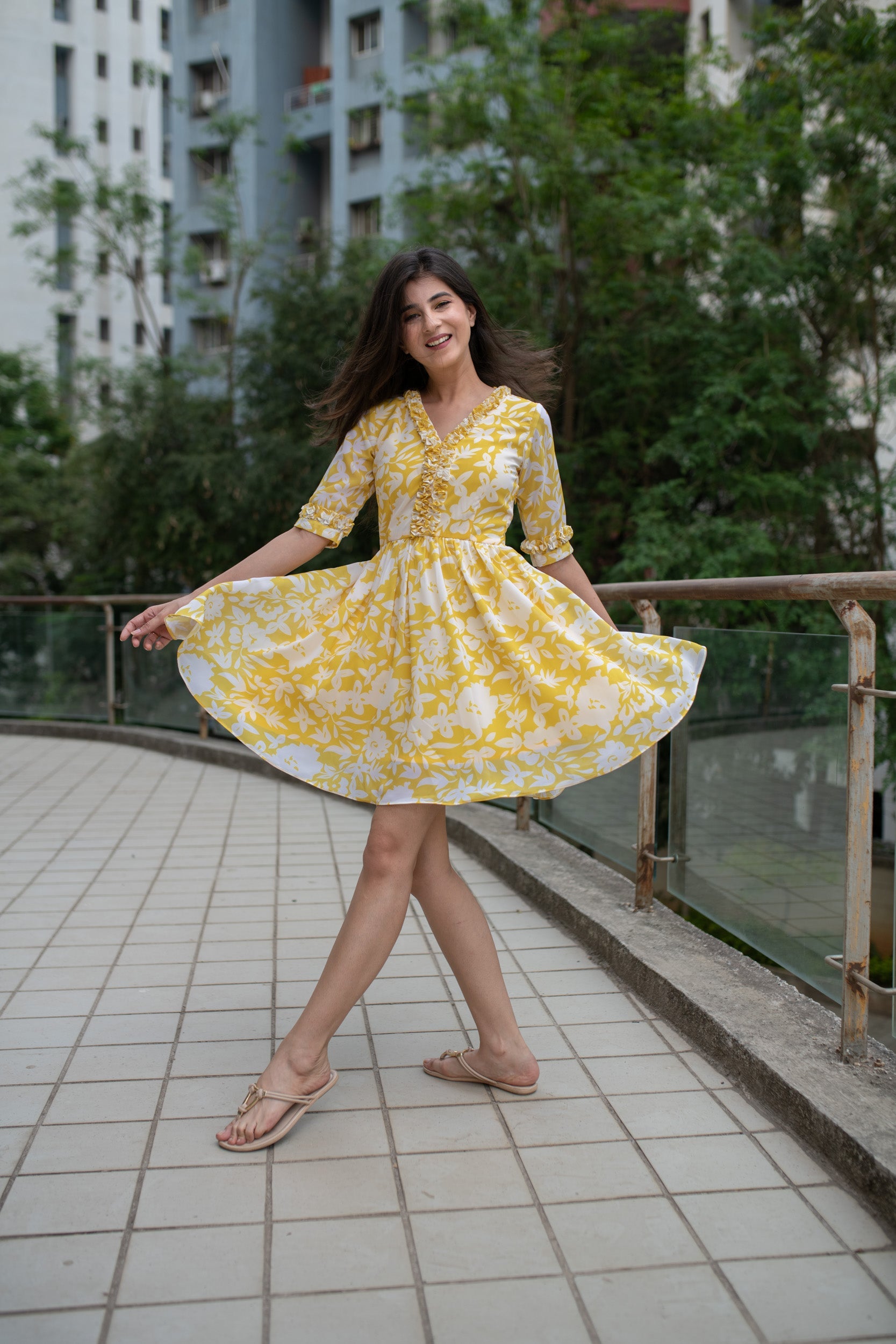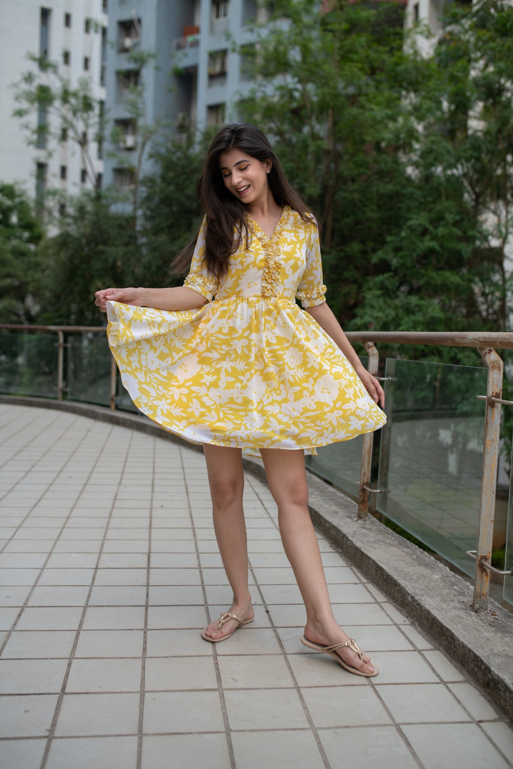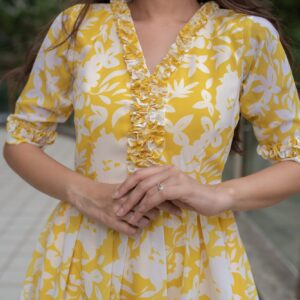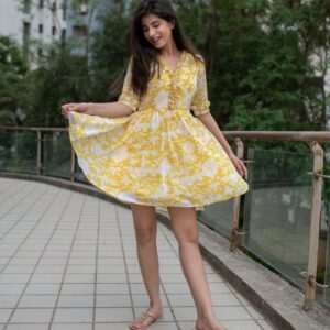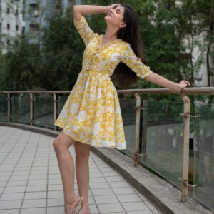 Trendia brings you this Yellow Short Dress for women by the brand Label Shaurya Sanadhya. The short dress is in a fit n flare pattern. It features a V-neck with elbow sleeves and mid-thigh length. The yellow dress is made of Georgette. Check out the photos of the yellow dress for more details.